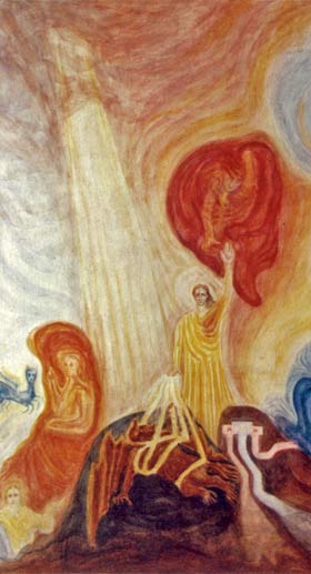 Direkt neben Christus ist eine Engelsgestalt zu sehen und daneben ein Kentaur, darunterder Repräsentant der künftigen slawischen Kulturepoche zusammen mit seinem Doppelgänger und dem Rosenkreuz / Ausschnitt aus der Deckenmalerei an der kleinen Kuppel des ersten Goetheanums / um 1918