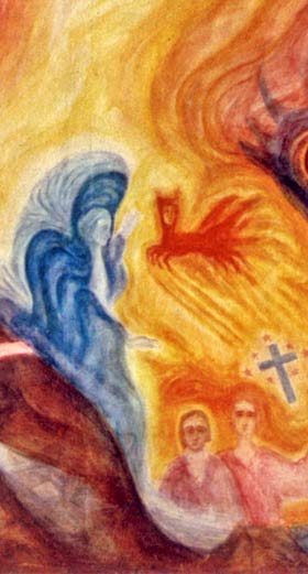 Der Menschheitsrepräsentant (Christus, ein Arm nach oben, ein Arm nach unten haltend) zwischen Luzifer (oben) und Arhiman (unten) / Ausschnitt aus der Deckenmalerei an der kleinen Kuppel des ersten Goetheanums / um 1918