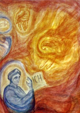 Faust als typischer Repräsentant unserer Zeit, der ein aufgeschlagenes Buch betrachtet, in dem das Wort ICH (hier geschrieben als «JCH», womit zugleich auf die Initialen des Jesus Christus hingewiesen wird) zu lesen ist / Ausschnitt aus der Deckenmalerei an der kleinen Kuppel des ersten Goetheanums / um 1918