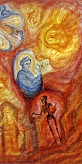 Auf dem Thron unserer gegenwärtigen Kulturepoche steht ein menschliches Skelett mit einem Buch in der Hand, darüber Faust und Inspirator / Ausschnitt aus der Deckenmalerei an der kleinen Kuppel des ersten Goetheanums / um 1918